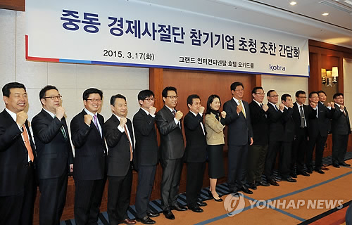 | △ 코트라, 중동경제사절단 성과 점검 및 후속 지원방안 논의 (서울=연합뉴스) 김재홍 대한무역투자진흥공사(KOTRA) 사장(왼쪽에서 아홉번째)이 17일 오전 서울 강남구 그랜드인터콘티넨탈호텔에서 중동 경제사절단 참가기업 관계자들과 간담회를 갖기에 앞서 기념촬영을 하고 있다. 이날 간담회에서 코트라는 지난 1~9일 중동 4개국을 순방한 경제사절단의 파견 성과를 점검하고 후속 지원방안에 대해 논의했다. 2015.3.17 utzza@yna.co.kr |
