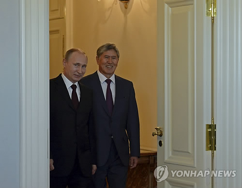| △ 11일 만에 나타난 푸틴 "소문 없으면 심심해" (AP=연합뉴스) 블라디미르 푸틴 러시아 대통령(왼쪽)이 16일(현지시간) 알마즈벡 아탐바예프 키르기스스탄 대통령과 함께 러시아 제2도시 상트페테르부르크 인근 스트렐나 지역의 콘스탄티노프스키 궁 회담장으로 들어서고 있다. 이날 푸틴의 공식석상 등장은 지난 5일 이후 공개 석상에 나타나지 않아 건강 이상설과 늦둥이설 등 갖가지 소문이 난 지 11일 만의 일이다. 푸틴 대통령은 이날 북해함대에 전면 경계태세에 돌입하고 불시 전투태세 점검 훈련을 실시할 것을 지시했다. |