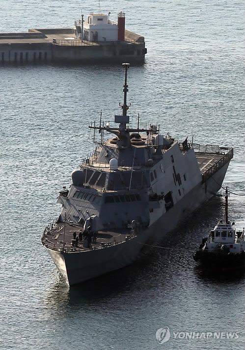 | △ 미 연안 전투함 포트워스함 입항 (부산=연합뉴스) 조정호 기자 = 독수리훈련에 참가한 미 해군의 연안전투함(LCS)인 포트워스함(3천t)이 14일 해군작전사령부 부산기지에 입항하고 있다. LCS는 항공기의 제트 엔진처럼 엔진과 연결된 펌프를 돌려 배 밑바닥의 흡입구로 물을 빨아들이는 제트 엔진 추진 장치로 움직인다. 얕은 해저 지형에서 자유롭게 작전을 펼 수 있다. 이 함정에는 100여 명의 장병이 승선하고 MH-60R 시호크 헬기와 MQ-8B 파이어 스카우트 무인헬기를 탑재하고 있다. 2015.3.14 ccho@yna.co.kr |