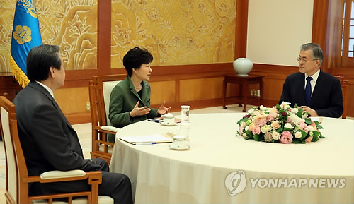| △ 대화하는 박 대통령과 여야 대표 (서울=연합뉴스) 도광환 기자 = 박근혜 대통령과 새누리당 김무성 대표, 새정치민주연합 문재인 대표가 17일 오후 청와대에서 열린 여야대표 회동에서 대화하고 있다. |