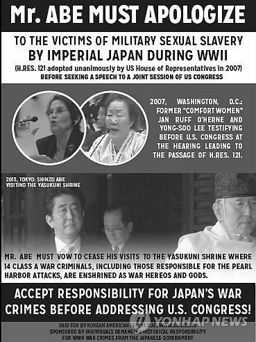 | △ "상하원 합동연설 전 야스쿠니 신사참배 중단 맹세하라" (워싱턴=연합뉴스) 노효동 특파원 = 미국 워싱턴DC에 기반을 둔 '더 힐'(The Hill)은 18일(현지시간)자 신문에서 '아베는 2차대전 당시 일제 군에 의해 성노예로 살았던 희생자들에게 사과하라'(Mr. Abe must apologize)는 제목으로 아베 신조(安倍晋三) 일본 총리의 미국 상·하원 합동연설에 반대하는 광고를 실을 예정이다. 이 광고는 미국 전역에서 한인 풀뿌리 운동을 전개 중인 시민참여센터(KACE)의 주도로 한인들과 관련 단체들로부터 기부를 받아 제작됐다. 2015.3.18 << 시민참여센터(KACE) 제공 >> rhd@yna.co.kr |