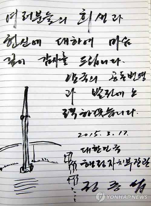 | △ '감사드립니다' (서울=연합뉴스) 정종섭 행정자치부 장관이 17일(현지시간) 오후 에티오피아 아디스 아바바에 위치한 한국전 참전용사 기념공원를 방문, 참전용사 기념탑에서 헌화·묵념을 한 뒤 남긴 방명록. 정 장관은 아프리카 5개국과 함께 한·아프리카 행정장관회의를 개최할 예정이다. 2015.3.18 << 행정자치부 제공 >> photo@yna.co.kr |