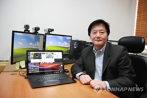 | △ 차세대 스마트고속도로 핵심기술 개발 (경산=연합뉴스) 이강일 기자 = 차세대 스마트고속도로에서 현재의 톨게이트 발권시스템을 대체할 핵심기술인 '스마트 톨링 시스템'에 사용할 수 있는 '번호판 인식 엔진'을 개발한 경일대 전자공학과 김진호(54) 교수. 2015.3.18 <<경일대>> leeki@yna.co.kr |