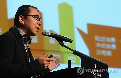 | △ 유쿠그룹 소개하는 동 야웨이 (서울=연합뉴스) 양지웅 기자 = 18일 오후 서울 강남구 삼성동 그랜드 인터컨티넨탈 서울 파르나스에서 열린 '한중 문화 콘텐츠 합작 프로그램 제작발표회 및 중국 미디어 기업 설명회'에서 동 야웨이 유쿠투도우그룹 최고마케팅경영자가 유쿠그룹을 소개하고 있다. 2015.3.18 yangdoo@yna.co.kr |