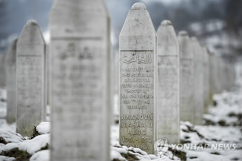 | △ 스레브레니차 인종학살 용의자들 20년만에 체포 *본문 수정/ "외곽의 한 창고" 생략 (AP=연합뉴스) 세르비아와 보스니아의 합동 검찰수사팀이 1995년 발생했던 스레브레니차 학살 사건의 용의자 7명을 사건 발생 20년 만에 체포했다고 18일(현지시간) 밝혔다. 스레브레니차 학살 사건이란 옛 유고연방 내전 때인 당시 스레브레니차에서 보스니아 무슬림 남자 8천 명이 무더기로 살해당한 사건을 말한다. 사진은 스레브레니차 외곽에 있는 희생자들의 기념 묘소. marshal@yna.co.kr |