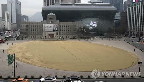 | △ (서울=연합뉴스) 윤동진 기자 = 17일 오후 서울시청 광장의 흙이 새 잔디를 깔기 위해 고르게 정리돼 있다. 2015.3.17 |
