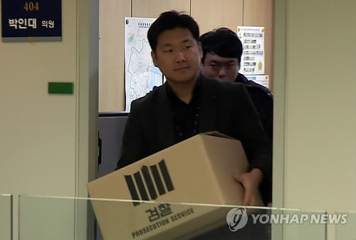 | △ 검찰, 박인대 부산시의원 사무실 압수수색 (부산=연합뉴스) 오수희 기자 = 부산지검 수사관들이 19일 오전 박인대 부산시의원 사무실을 압수수색해 자료를 들고 나오고 있다. 박 시의원은 동부산관광단지 푸드타운 시행사 대표에게서 금품을 받은 혐의로 체포됐다. 2015.3.19 osh9981@yna.co.kr |
