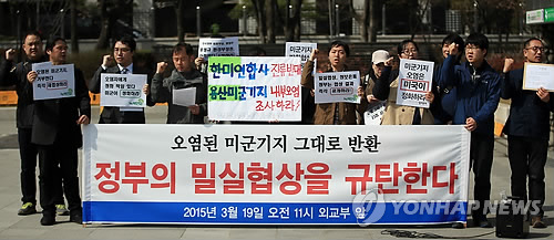 | △ 미군기지 환경오염 정화 비용 전가 규탄 (서울=연합뉴스) 홍해인 기자 = 불평등한 한미주둔군지위협정(SOFA) 개정연대 등 16개 시민단체 회원들이 19일 오전 서울 도렴동 외교부 앞에서 주한미군기지 환경오염 부담금을 주한미군기지 반환 협상에서 환경오염 정화 비용을 한국이 부담하기로 한 것을 규탄하는 기자회견을 하고 있다. 2015.3.19 hihong@yna.co.kr |