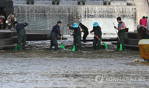 | △ 청계천 봄단장 (서울=연합뉴스) 임헌정 기자 = 완연한 봄날씨를 보인 19일 서울 중구 청계천에서 봄맞이 대청소 작업이 실시되고 있다. 2015.3.19 kane@yna.co.kr |