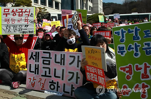 | △ 경남도의회가 19일 임시회를 열어 무상급식 예산 지원을 중단하고 그 예산으로 시행하는 서민 자녀 교육지원 사업 관련 조례안을 통과시킨 가운데 경남도의회 앞에서 무상급식지키기 경남학부모대회가 열리고 있다. |