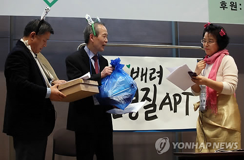 | △ '배려 통해 사회갈등 해결' 배려문화포럼 창립 (서울=연합뉴스) 김주성 기자 = 20일 오후 서울 중구 프레스센터에서 열린 배려문화포럼 선포식에서 고문을 맡은 장석춘 전 한국노총위원장(왼쪽부터), 장기표 신문명정책연구원장과 운영위원을 맡은 김윤경 환경강사가 배려문화가 절실한 아파트 경비원과 주민의 관계를 다룬 연극을 선보이고 있다. |