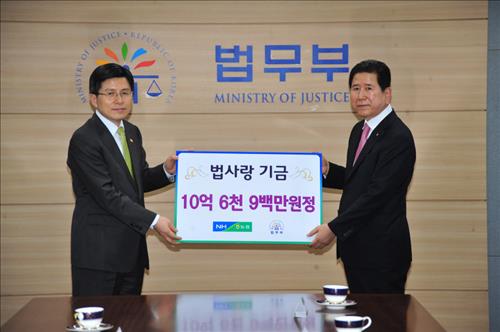 (세종=연합뉴스) 차병섭 기자 = 농협중앙회는 20일 법무부에 다문화가정 법교육 서비스 등에 쓰이는 법사랑기금 10억6천900만원을 전달했다.