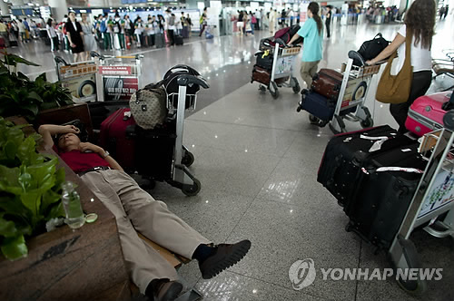| △ 베이징 국제 공항에서 항공기를 기다리며 잠든 승객 모습. (AP=연합뉴스 자료사진) |