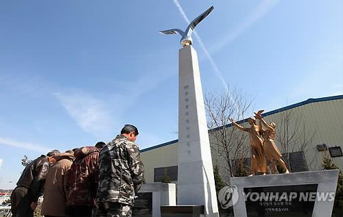 (인천=연합뉴스) 손현규 기자 = 날개를 펼친 갈매기는 푸른 바다 위로 비상하려다가 말고 주저앉았다. 청동상의 갈매기가 내려앉은 7.5m 높이 위령비는 쓸쓸히 부두 광장을 지켰다.