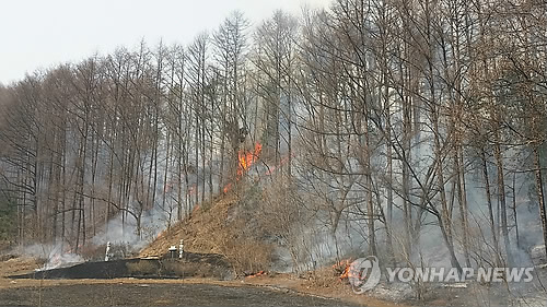 소방 당국은 헬기 2대와 소방 펌프차량을 동원해 진화 작업을 벌이고 있으나 초속 7∼8m의 강풍 때문에 진화에 어려움을 겪고 있다.