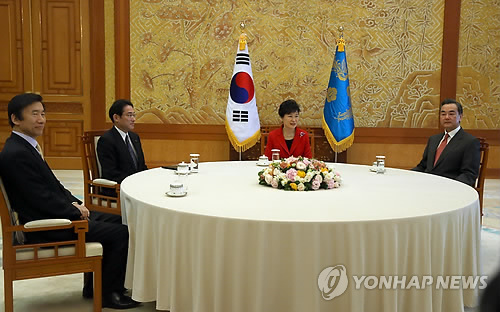 박 대통령은 21일 제7차 한중일 외교장관회의 참석차 방한한 왕이(王毅) 중국 외교부장과 기시다 후미오(岸田文雄) 일본 외무상을 청와대에서 동시에 접견한 자리에서 올해가 광복 및 종전 70주년, 한일 수교 50주년의 '역사적 해'라는 점을 거론, "(이런) 역사가 3국에 협력의 모멘텀을 선사하는 소중한 한 해가 될 것으로 기대한다"고 말했다.