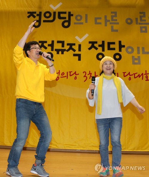 | △ 춤추는 정의당 대표 (서울=연합뉴스) 백승렬 기자 = 정의당 천호선 대표와 심상정 원내대표가 22일 국회 의원회관에서 열린 3차 정기당대회에서 춤을 추며 노래를 부르고 있다. 2015.3.22 srbaek@yna.co.kr |