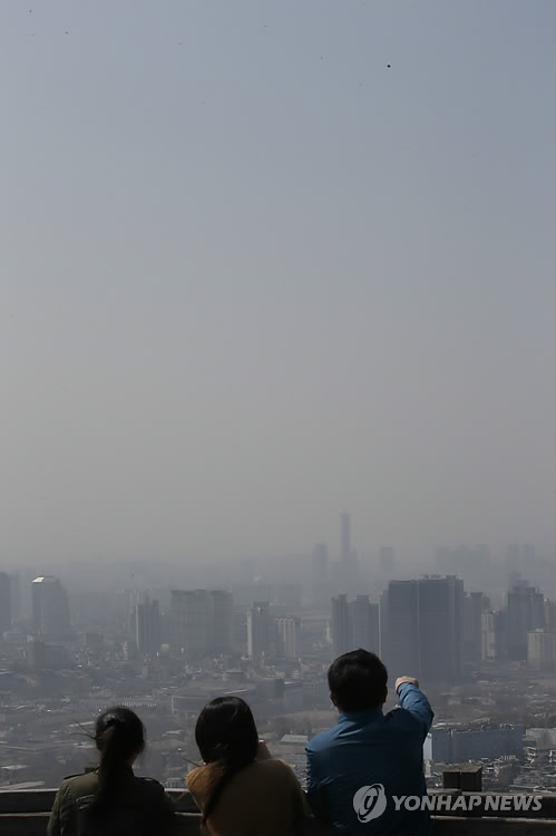 | △ '봄 불청객' 황사 (서울=연합뉴스) 이상학 기자 = 내몽골과 중국 북서부에서 발원한 황사의 영향으로 전국 대부분 지역에 옅은 황사가 나타난 22일 남산을 찾은 시민들이 서울 상공을 바라보고 있다. |
