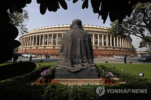 | △ (AP=연합뉴스) 마하트마 간디 동상이 인도 뉴델리의 의회 건물을 내려다보고 있다. 사진은 지난 2월28일 촬영된 것. |