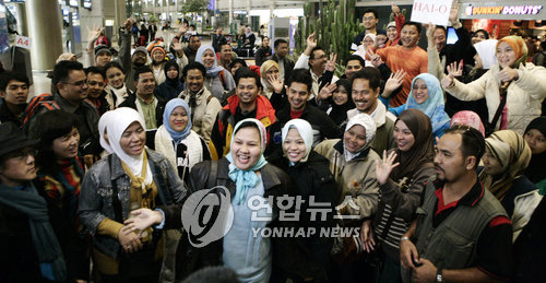 | △ 한국을 찾은 무슬림 관광객들이 인천국제공항에 도착해 기념촬영을 하고 있다. (연합뉴스 자료사진) |