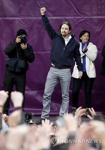 2011년 분노하라 시위에 참가했던 지도자들이 뭉쳐서 작년 1월 포데모스를 창당했다. 말총머리를 하고 청바지를 입고 다니는 파블로 이글레시아스(36)가 당 대표로 인기를 끌고 있다.