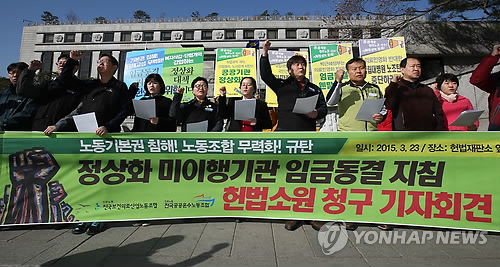 노조 관계자 20여명은 이날 오전 서울 종로구 헌법재판소 앞에서 기자회견을 열어 "정부가 방만경영 개선계획을 이행하지 못한 13개 공공기관의 올해 임금을 동결 통보한 것은 임금교섭을 위한 단체교섭권을 무력화하는 행위"라고 주장했다.