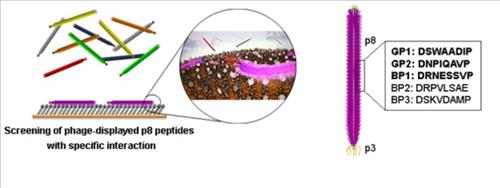 | △ 벤젠 모사 기판에 특정 박테리오파지가 붙는 방식과 박테리오파지의 자세한 구조 모식도. 펩티드 라이브러리를 기판과 결합시킨 후 잘 씻어내면 특정 펩티드로 둘러싸인 박테리오파지만이 벤젠 모사기판에 붙어서 남는다. |