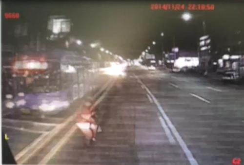 | △ (서울=연합뉴스) 지난해 11월 24일 오후 10시 10분께 서울 강서구 공항동 송정역 인근 도로에서 김모(64·여)씨가 간이중앙분리대가 설치되지 않은 도로에서 무단횡단을 하다 시내버스에 치여 숨졌다. 사진은 사고 순간. 강서구에서는 작년 한 해에만 교통사고로 모두 30명이 사망해 교통사고 사망 위험이 가장 큰 자치구라는 오명을 썼다. 2015.3.23 << 서울지방경찰청 제공 >> |