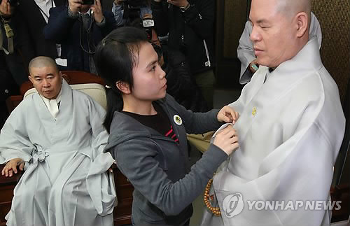 | △ 노란색 리본 달아주는 세월호 실종자 가족 (서울=연합뉴스) 임헌정 기자 = 세월호 실종자 가족이 23일 서울 종로구 견지동 조계사 한국불교역사문화기념관을 찾아 조계종 자승 총무원장과 면담을 마치고 자승 총무원장에게 노란색 리본을 달아주고 있다. 세월호 실종자 가족들은 세월호 인양에 대한 불교계의 관심을 촉구하기 위해 이날 조계사를 찾았다. 이들은 이후 천주교와 개신교 단체도 찾아 정부가 조속히 세월호 인양 결정을 내리도록 종교계가 역할을 해달라고 부탁할 예정이다. 2015.3.23 kane@yna.co.kr |