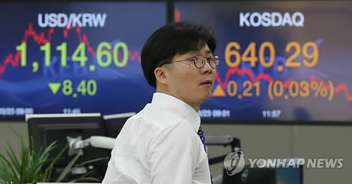 | △ 코스닥 상승 (서울=연합뉴스) 임헌정 기자 = 코스닥지수가 3거래일 연속 상승해 6년 9개월만에 최고치를 갈아치웠다. 23일 코스닥지수는 0.21포인트(0.03%) 상승한 640.29에, 코스피는 전 거래일보다 0.65포인트(0.03%) 하락한 2,036.59에 각각 거래를 끝냈다. 사진은 이날 오후 서울 중구 을지로 외환은행 본점 딜링룸. |