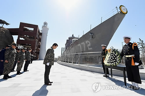 | △ 한민구 장관, 천안함 희생장병 추모 (서울=연합뉴스) 한민구 국방부 장관이 천안함 피격사건 5주년을 앞둔 23일 경기도 평택 해군 2함대사령부를 방문, 천안함 희생장병을 추모하고 있다.(국방부 제공) |
