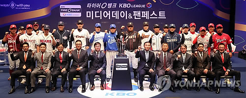 | △ '우승을 향해' (서울=연합뉴스) 한종찬 기자 = 23일 오후 서울 서대문구 대현동 이화여대 ECC 삼성홀에서 열린 '2015 타이어뱅크 KBO 미디어데이 & 팬페스트' 행사에서 참석한 감독들과 선수들이 파이팅 구호를 외치고 있다. 2015.3.23 saba@yna.co.kr |