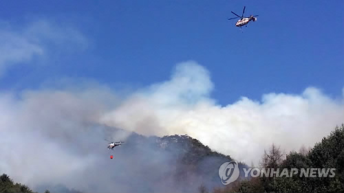 | △ 홍천서 산불…헬기 진화 (홍천=연합뉴스) 23일 오후 강원 홍천군 화촌면 군업리 야산에서 불이 나 산림당국이 헬기를 동원해 진화작업을 벌이고 있다. 2015.3.23 hak@yna.co.kr |