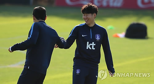 | △ 밝은 표정의 손흥민 (파주=연합뉴스) 김도훈 기자 = 우즈베키스탄과의 평가전을 사흘 앞둔 24일 오후 경기도 파주 국가대표트레이닝센터(NFC)에서 실시된 소집훈련에서 손흥민이 동료와 밝게 웃으며 이야기하고 있다. 2015.3.24 superdoo82@yna.co.kr |