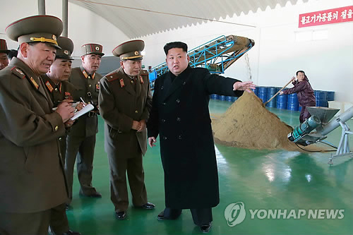 | △ 북한 김정은, 양어사료공장 시찰 (서울=연합뉴스) 김정은 북한 국방위원회 제1위원장이 새로 지어진 '어분사료공장'을 현지지도했다. 노동신문이 24일 게재한 관련 사진에는 김 제1위원장이 황병서 총정치국장을 비롯한 군 간부들을 대동하고 공장을 둘러보는 모습이 담겼다. 2015.3.24 nkphoto@yna.co.kr |