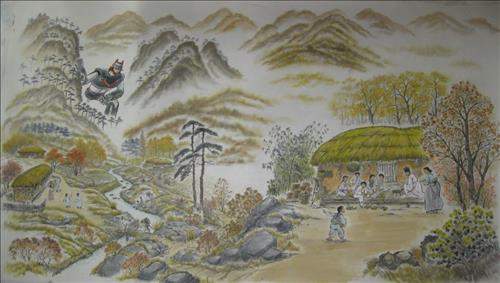 옛것을 재현해보고 싶다는 생각에 조선시대를 배경으로 한 산수화, 풍속화에 상징적으로 로봇 태권브이를 그려넣었다고 한다.