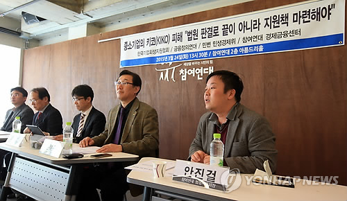 | △ 키코(KIKO) 피해 사례 종합 발표회 (서울=연합뉴스) 홍해인 기자 = 24일 오후 서울 통인동 참여연대 아름드리홀에서 한국기업회생지원협회, 금융정의연대, 민변민생경제위원회, 참여연대 경제금융센터가 참여한 가운데 '키코(KIKO) 피해 사례 종합 발표회'가 열리고 있다. 2015.3.24 hihong@yna.co.kr |