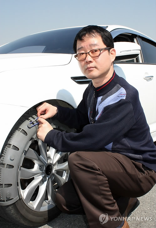 | △ 신개념 스노 체인 개발한 이수영씨 (수원=연합뉴스) 강창구 기자 = 빙판길도 거뜬히 달릴 수 있고 여성도 손쉽게 탈·부착할 수 있는 신개념 스노 체인, 일명 '스노타이어 커버'를 개발한 수원시 권선구 세무과 이수영(53·세무7급)씨. 2015.3.25 kcg33169@yna.co.kr |