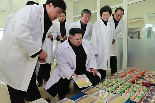 | △ 北 김정은, 체육인식품공장 시찰 (평양 조선중앙통신=연합뉴스) 김정은 북한 국방위원회 제1위원장이 체육인을 위한 식품공장인 평양 금컵체육인종합식료공장을 현지 지도했다고 조선중앙통신이 19일 보도했다. 2015.1.19 photo@yna.co.kr |