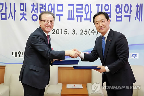 | △ 강호권 대한적십자사 사무총장(왼쪽)과 강요식 한국동서발전(주) 상임감사위원이 25일 서울 중구 대한적십자사 본사에서 '감사 및 청렴업무 교류와 지원 협약'을 체결하고 있다. 2015.3.25 << 대한적십자사 제공 >> |