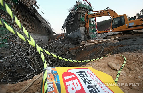 | △ 용인 도로공사 공사장 붕괴사고 현장 (용인=연합뉴스) 신영근 기자 = 25일 오후 경기도 용인의 한 도로공사 현장에서 붕괴사고가 발생해 소방관계자들이 혹 매몰된 작업자가 있는지 수색 작업을 벌이고 있다. |