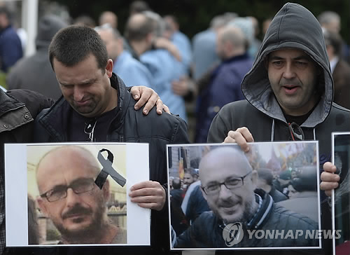 | △ (AP=연합뉴스) 25일(현지시간) 스페인 바르셀로나 인근 마을에서 열린 희생자 추모 모임에서 한 회사 직원들이 사고기에 탑승한 동료들의 사진을 들고 있는 모습. ) |
