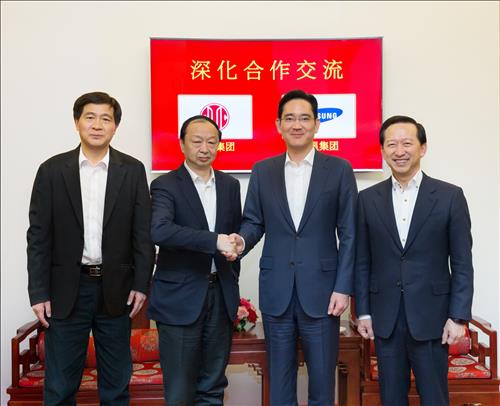 | △ 삼성전자 이재용 부회장은 지난 25일 중국 베이징에서 CITIC(중신)그룹 창쩐밍 동사장(董事長)을 만나 삼성과 CITIC그룹간 금융사업 협력 확대 방안에 대해 협의했음. 사진 왼쪽부터 중신증권 청보밍 사장, CITIC그룹 창쩐밍 동사장, 이재용 부회장, 삼성증권 윤용암 사장 |