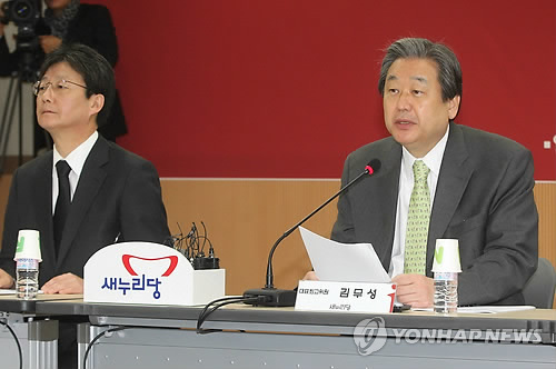 | △ 새누리당 대전현장최고위원회의 (대전=연합뉴스) 이재림 기자 = 새누리당 김무성 대표가 26일 오전 대전 유성구 기초과학연구원(IBS)에서 열린 대전최고위원회의에서 발언하고 있다. 왼쪽은 유승민 원내대표. 2015.3.26 walden@yna.co.kr |