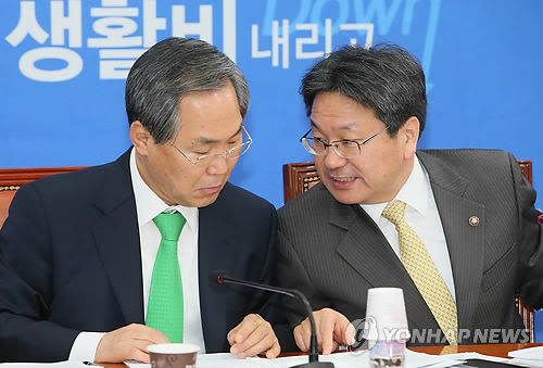 | △ 우윤근 강기정 논의 (서울=연합뉴스) 진성철 기자 = 새정치민주연합 우윤근 원내대표(왼쪽)와 강기정 정책위의장이 26일 국회에서 열린 정책조정회의에서 논의하고 있다. |