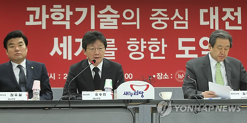 | △ 새누리당 대전현장최고위원회의 (대전=연합뉴스) 이재림 기자 = 새누리당 유승민 원내대표가 26일 오전 대전 유성구 기초과학연구원(IBS)에서 열린 대전최고위원회의에서 발언하고 있다. 오른쪽부터 김무성 대표, 유 원내대표, 원유철 정책위의장. |