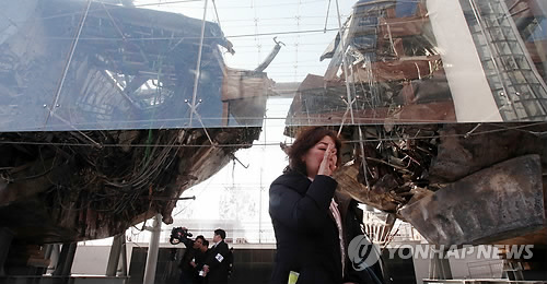| △ 천안함 앞에서 눈물 흘리는 천안함 46용사 가족 (평택=연합뉴스) 신영근 기자 = 천안함 피격 사건 5주년인 26일 오후 경기도 평택 해군 제2함대사령부 피격 천안함 앞에서 천안함 46용사 가족이 눈물을 흘리고 있다. |