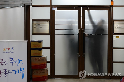 | △ 검찰, 중앙대학교 압수수색 (서울=연합뉴스) 김주성 기자 = 이명박 정부 시절 청와대 교육문화수석을 지낸 박범훈 전 중앙대 총장의 비리 혐의를 수사 중인 검찰이 27일 오전 서울 흑석동 중앙대학교를 압수수색했다. 학교 관계자들이 압수수색이 진행 중인 기획처, 법인사무처, 미래전략실 등이 있는 사무실 문을 잠그고 있다. 2015.3.27 utzza@yna.co.kr |