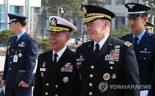 | △ 최윤희 합참의장과 마틴 뎀프시 미국 합참의장이 27일 오전 서울 용산구 합동참모본부에서 열린 환영 의장행사에서 이야기를 나누고 있다. |