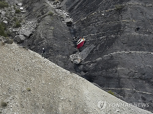 | △ (AP=연합뉴스) 독일 저먼윙스 항공사 여객기가 추락한 프랑스 남부 세인 레 잘프스 부근 알프스산에서 지난 25일(현지시간) 한 수색대원이 잔해가 흩어져 있는 비탈길을 오르고 있다. |